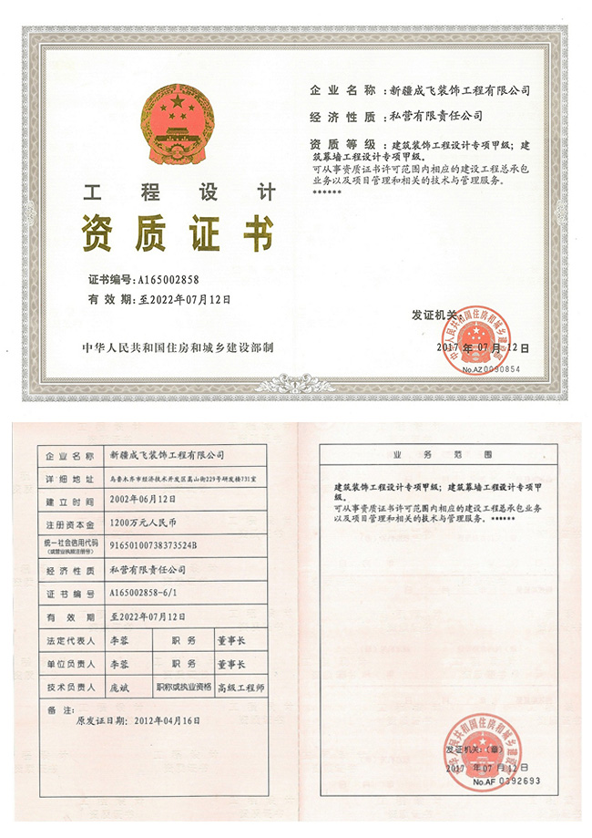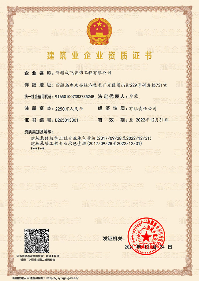 新疆成飛建設(shè)工程有限公司是一家以專注于裝飾工程領(lǐng)域,堅(jiān)持穩(wěn)健經(jīng)營、持續(xù)創(chuàng)新、開放合作的原則,在星級賓館、高檔寫字樓、大型商場、高級餐館、娛樂設(shè)施、車站、銀行等大型室內(nèi)外建筑工程(包括各類玻璃幕墻、石材幕墻、鋁板幕墻、鋼結(jié)構(gòu)室內(nèi)裝飾等工程)裝飾裝修...查看更多